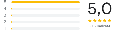 Bisher haben wir mehr als 300 Google Bewertungen erhalten und eine Bewertung von 5,0 von 5,0 Punkten erreicht.